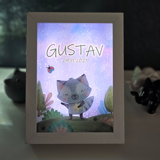 Nachtlicht mit Name & Geburtsdatum - niedliche Tiere in Landschaft - Waschbär